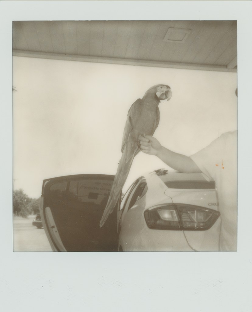 We’ve been home a week and I am sorting through what I brought back with me from this year‘s camping road trip. I’ve decided to keep things in chronological order, at least for now… . so here’s a haiku and a polaroid from the first day, one of our first stops. Who expects to see a macaw at a gas station at a crossroads way out in the country? NOT ME! His person was happy for me to photograph him and told me he was on his way to some kind of “free flight” get together with his other macaw friends.