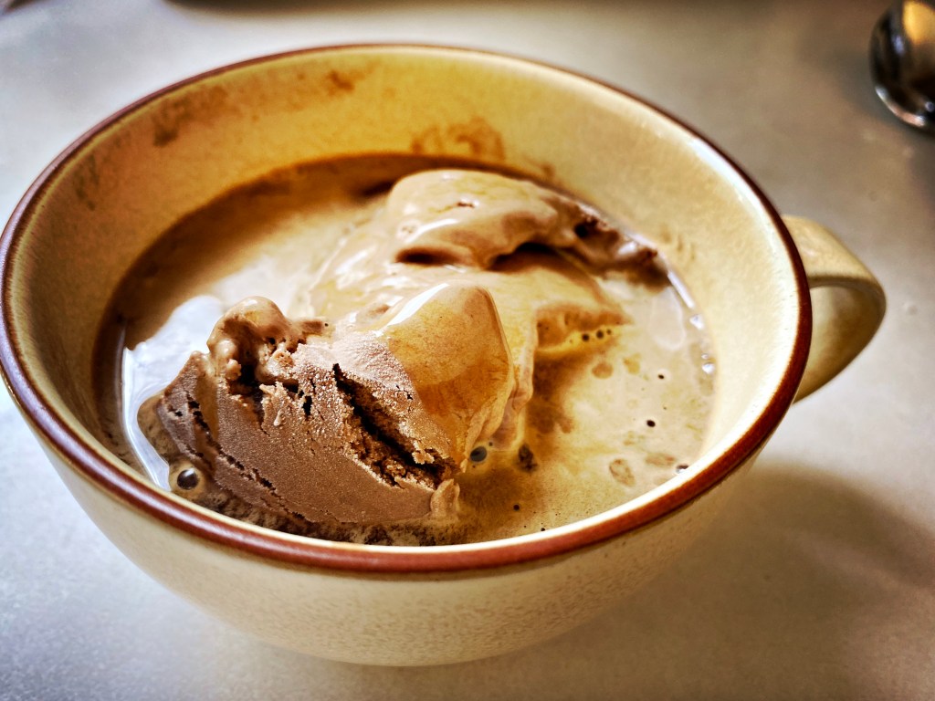 Somewhere the hens who laid the eggs whose yolks became custard at our stove are clucking around in free range happiness, considering their next morsel. Farther away, the wind is blowing through the coffee plants, a thunderstorm approaching over the mountains to shake and rattle every bean on the plantation when it rolls through. The farmer wipes his brow with a bandana, re-dons his hat, talks to someone over his shoulder. His neighbor meanwhile prepares another load of cocoa for the roaster, to be winnowed and fanned, made into cakes and ground, a fine powder in a plastic yellow box in the pantry, that graced not the espresso machine but the double boiler. Cows in the pasture low for their calves to come and sip the sweet cream that their dairy sisters donate at the parlor, to be refined and pasteurized, packaged and easily milked from the supermarket cabinet. On the west coast, grapes are ripening, to be picked under the perfect sun, fermented, and bottled into the wine that walloped me into the morning after decision to sit at my kitchen table and indulge in a chocolate affogato on a Friday before noon.