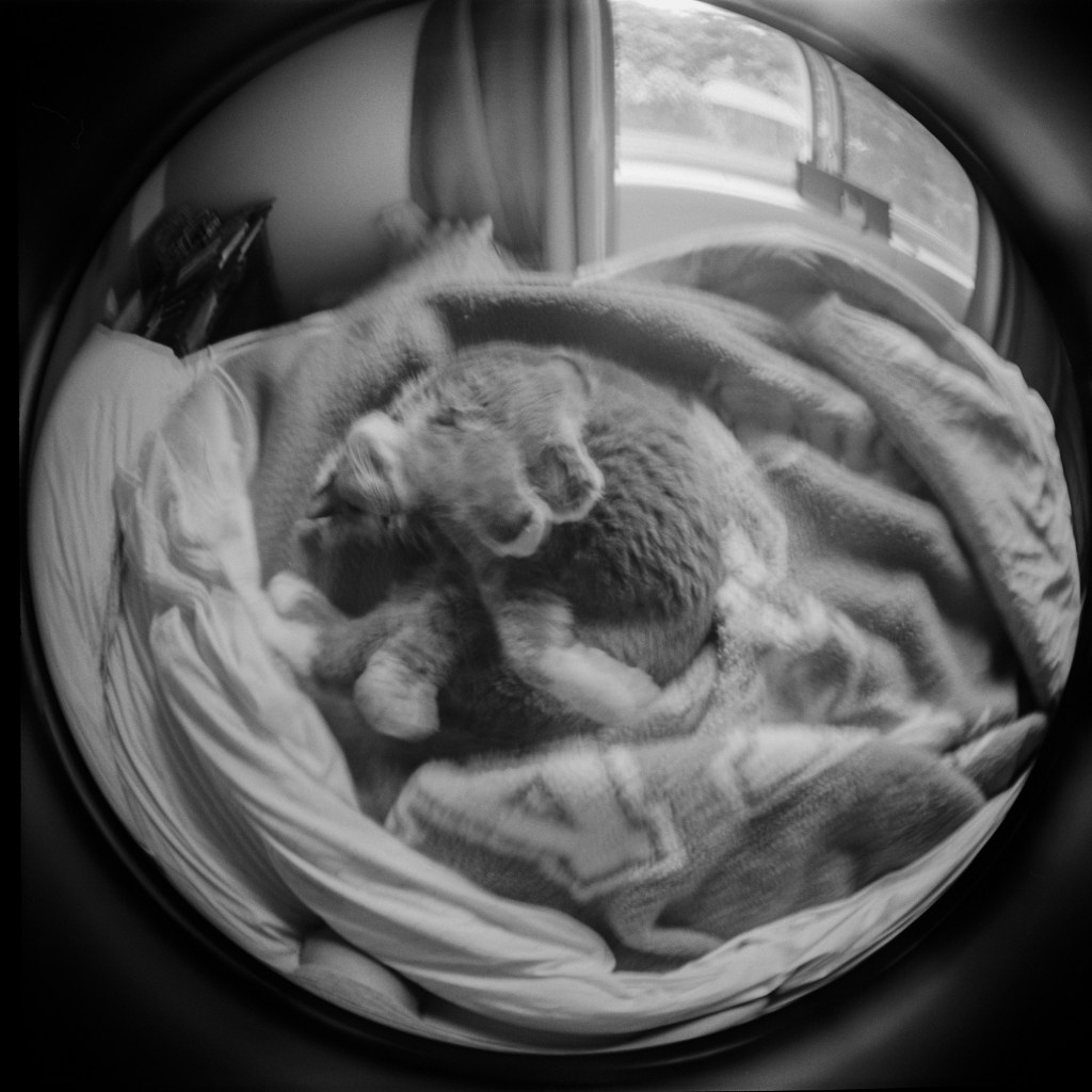 This is my cat: she’s not in the dryer, I used a fisheye lens on a Diana F+ camera, and made a double exposure (with Kodak film)