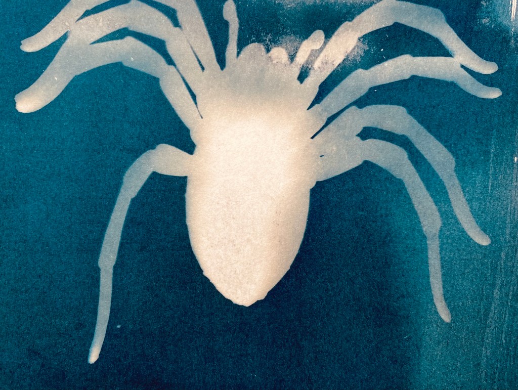 A photograph of long-legged hairy creepy crawly, enlarged in the night on a bedsheet that flaps in the wind. The gust gives all the long hairy legs watching the slide show the creepy crawlies on the back of the neck, then scuttles off to gently blow aside a few dry leaves to give long-legged hairy creepy crawly an easier path, without further interruptions, back to its place out of sight.