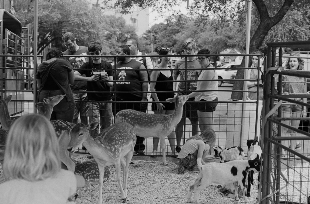 In a long movie, men push trash around with precision brooms, designed to tell time, while kids hop around, provoking color that pumps through a projector to the wall. Beside a room of singing faces, still the eyes of the immigrant keep staring. Common doo-wop chords keyed out note by note fill the space with a wonder of music. Volunteers line up for a single tone while upstairs lights flash, and a video of illusions prepares to have the last word.